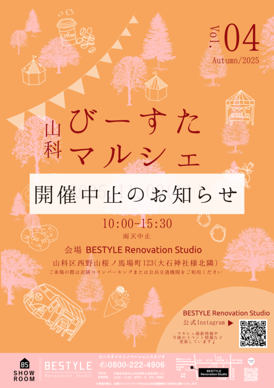 11月9日(日)に開催を予定しておりました「びーすたマルシェVol.04」は悪天候の予報を受け、やむを得ず中止とさせていただくこととなりました。