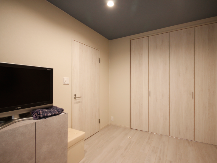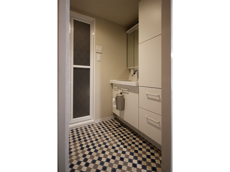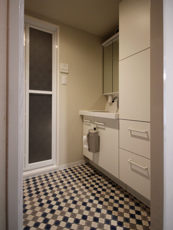 「お部屋ごとに壁や天井とカーテンの色をそろえたり、洗面所の床はお風呂の壁、床の色にあったコラベルタイル調のクッションフロアにしてもらい、すっきりした空間にしていただきました。」