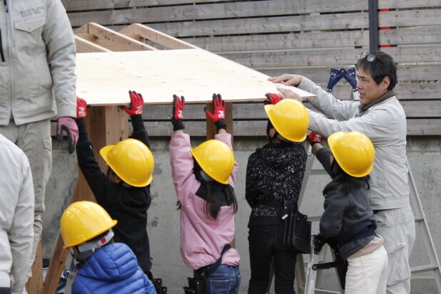 土台づくりから屋根板を張るところまで体験できます。柱を立て、梁を組み、少しずつ「家の形」になっていく工程を実際に手を動かして学びます。
